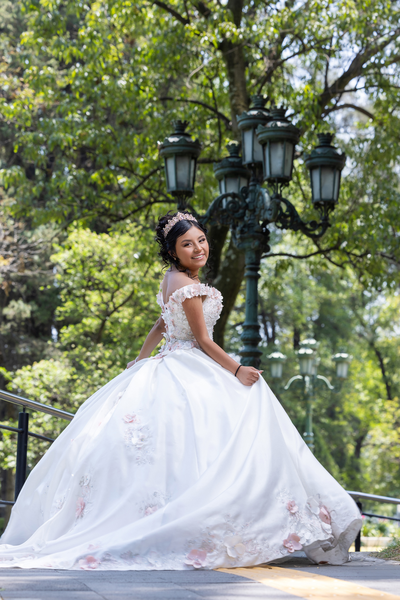 Para esta sesión, aprovechamos la temporada de primavera. Los caminos estaban adornados con toques de jacarandas, creando una atmósfera de cuento de hadas que complementaba perfectamente el vestido de nuestra quinceañera.