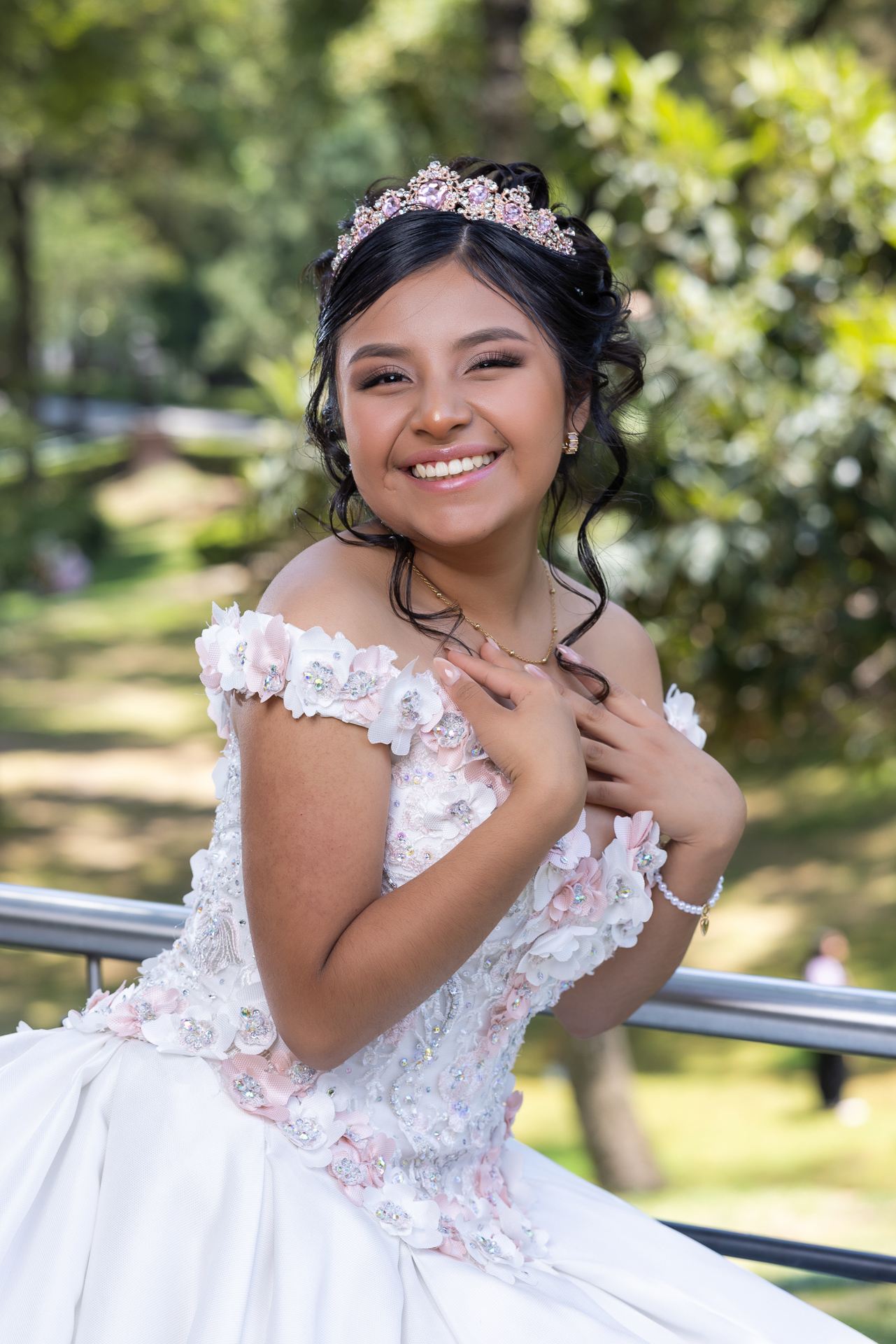 El entorno natural de Los Pinos, con sus verdes intensos, fue el contraste ideal para hacer brillar los detalles rosados del vestido y su increíble tiara. Buscamos capturar no solo poses majestuosas, sino también momentos genuinos, sonrisas naturales y la alegría de este día tan especial.