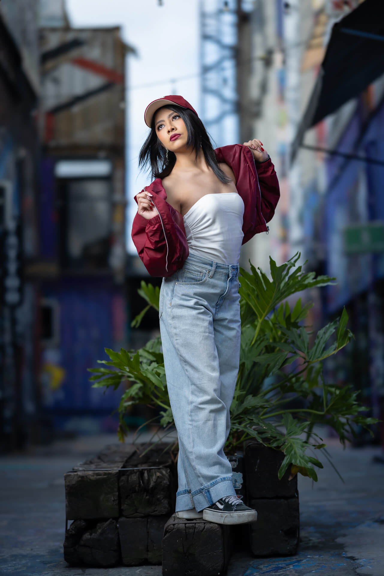 Elegir una temática urbana nos permitió jugar con una estética “Rock/Street”. La camiseta deportiva oversize, los jeans anchos y el bajo no son un disfraz, son una extensión de sus gustos musicales y su carácter fuerte. Para mí, capturar eso es el verdadero objetivo de la fotografía de retrato.